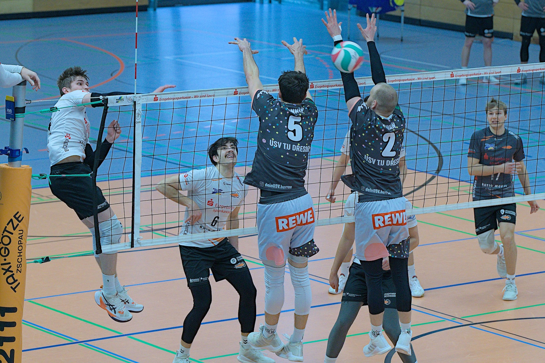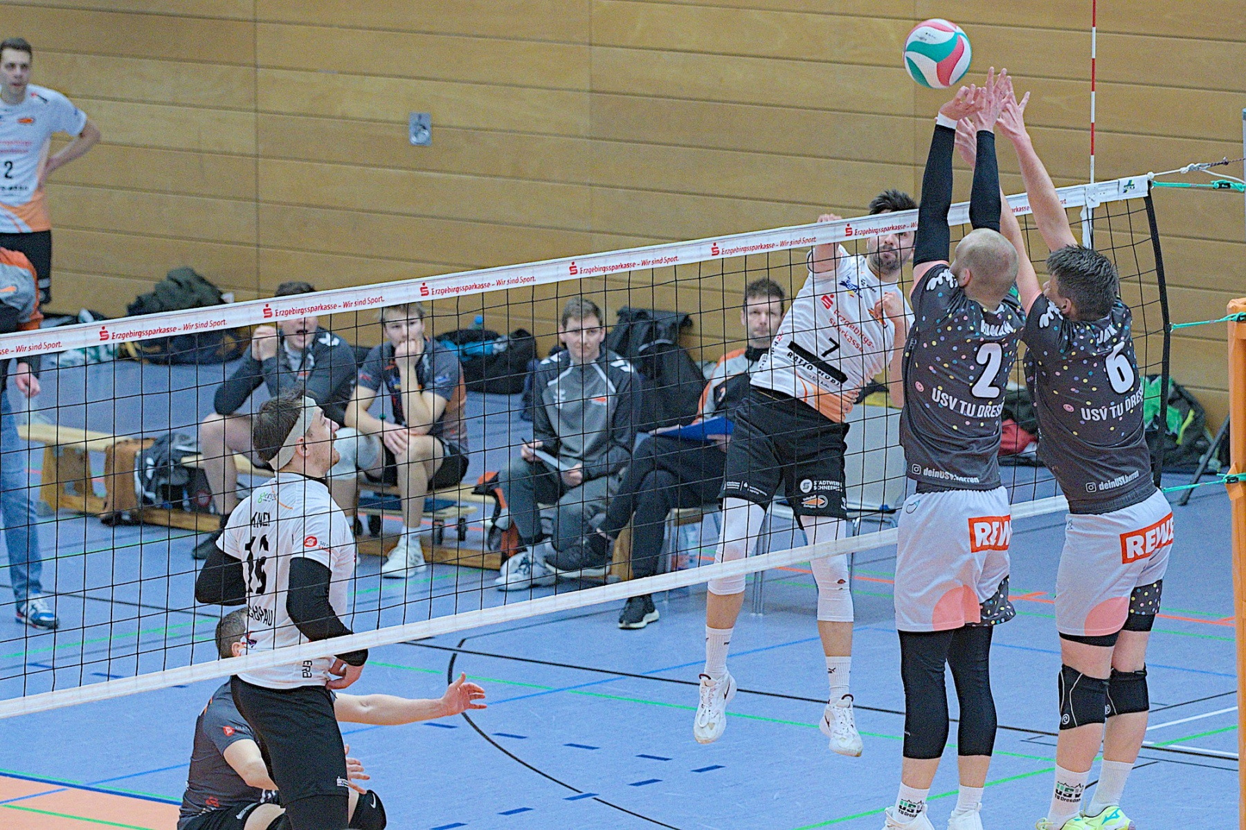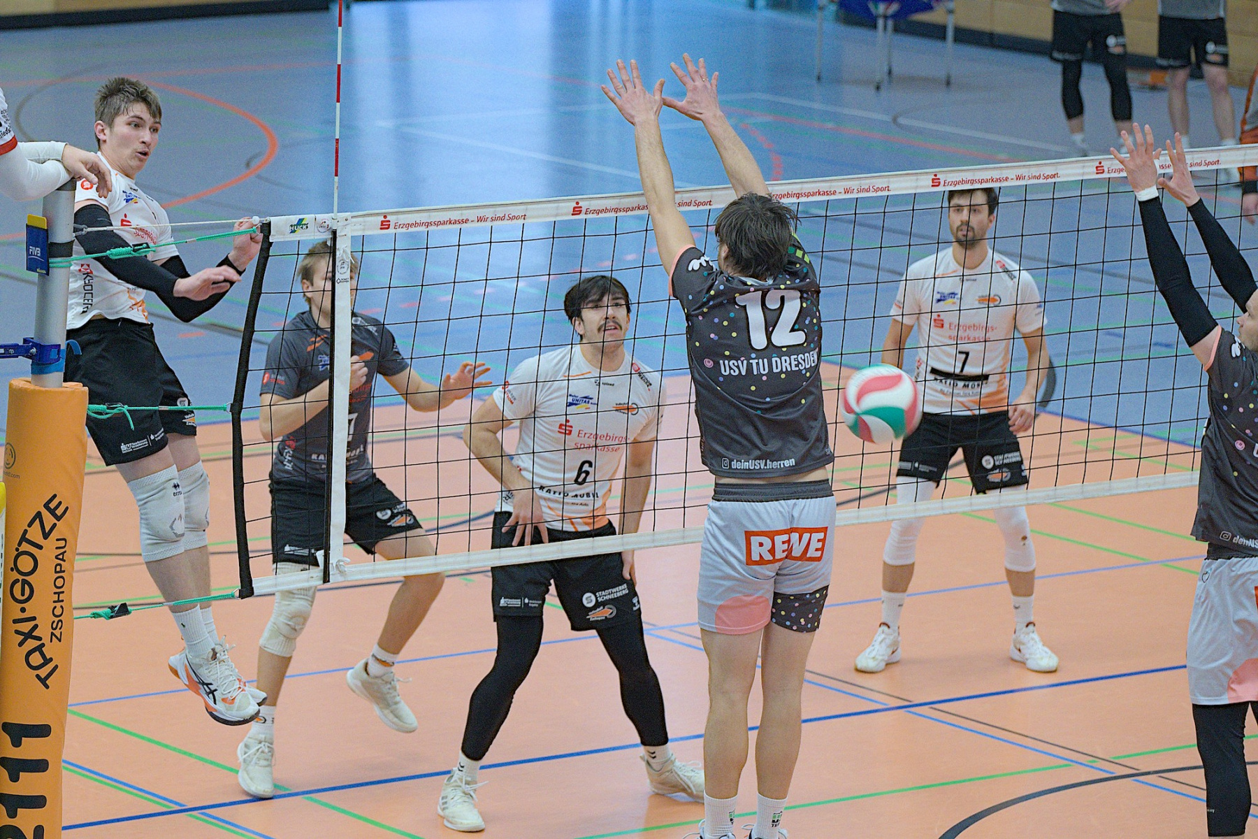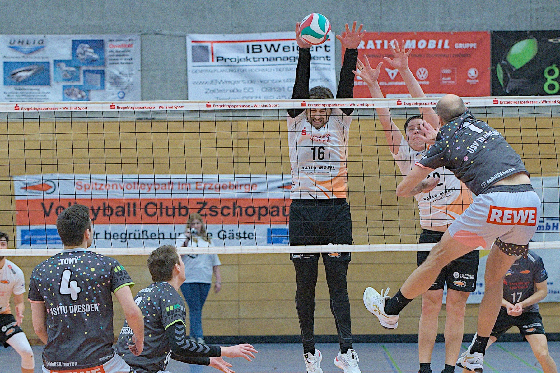 Trotz ungewöhnlicher Zeit und bevorstehendem Handball-EM-Finale versammellten sich ca. 150 Volleyballenthusiasten in der VC-Arena zum vermeindlichen Spitzenspiel der Regionalliga Ost der Männer. Mit dem USV TU Dresden reiste immerhin der aktuelle Zweite der Liga an. Was die Tabellenposition allerdings nicht aussagt ist, dass die diesjährige Liga vom Leistungsvermögen der Mannschaften her ein ziemliches Zerrbild wiedergibt. Mal abgesehen vom SV Reudnitz, der einsam seine Kreise zieht und 14 seiner bisherigen 15 Pflichtspiele gewonnen hat, kann eigentlich noch jede Mannschaft mit dem Abstiegsgeschäft zu tun haben, so ausgeglichen stellt sich das aktuell dar.